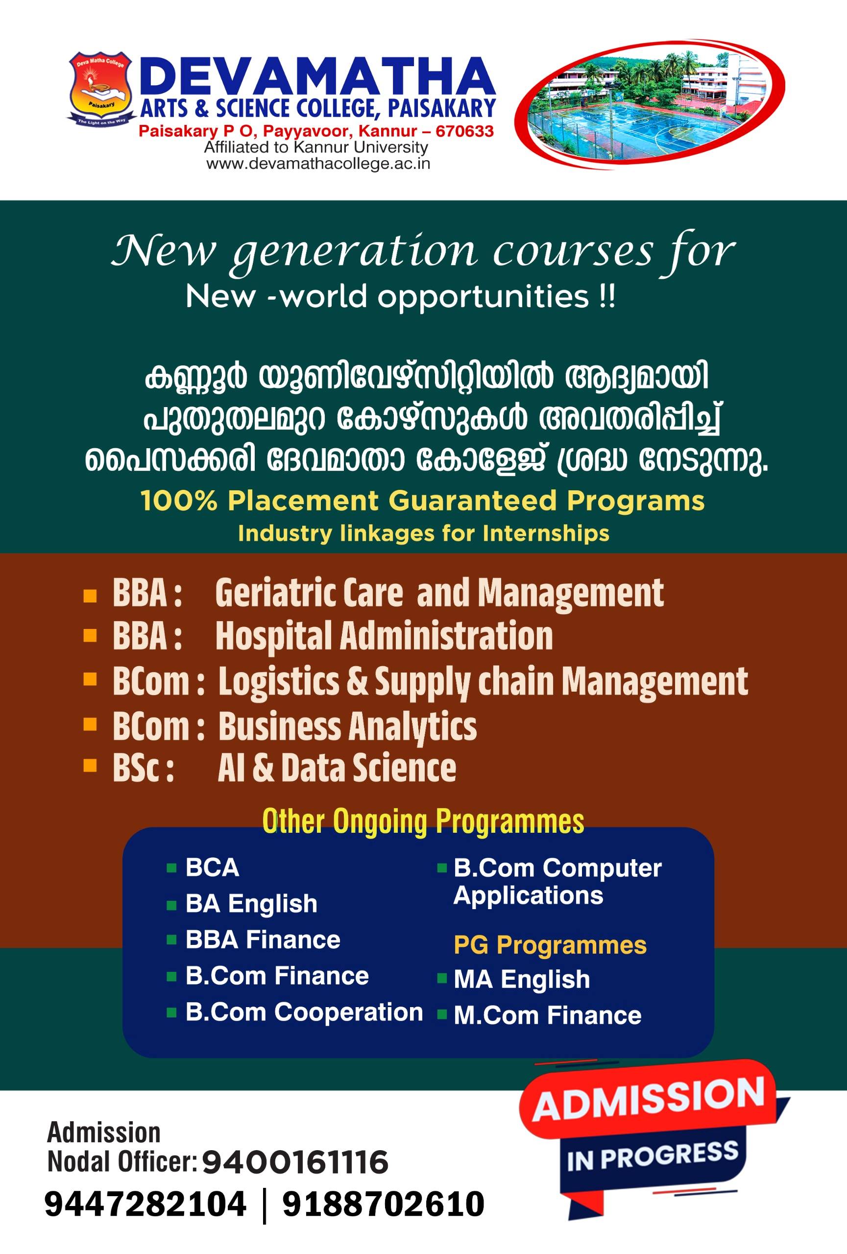 The Catholic Christian community at Deva Matha Forane Church, Paisakary, under the Syro-Malabar Metropolitan Archdioceses of Thalassery, wanted an institution of higher learning for a long time for the higher education of its youth, and thus to bring about the all-round development of the region. Their long-cherished dream saw fruition under the able leadership of the then Vicar of Deva Matha Forane Church, Rev. Fr. John Mullakkara (2003-2005).
